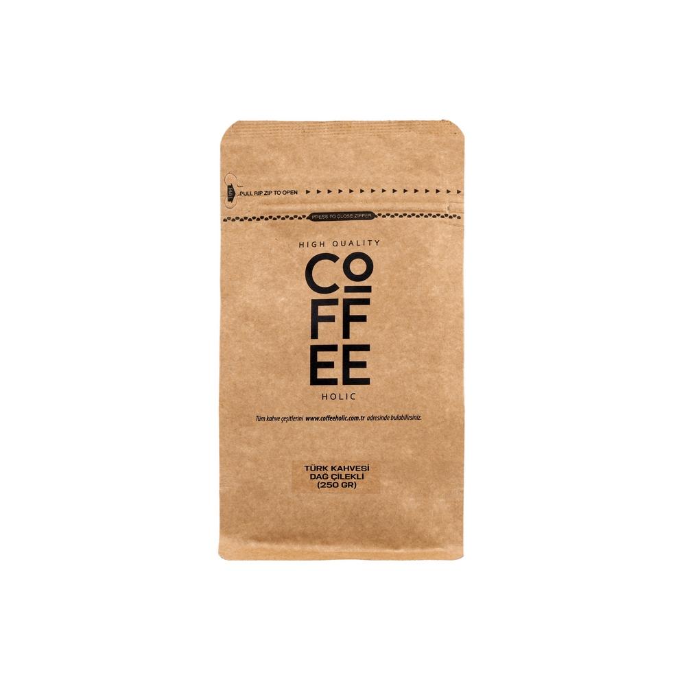 Coffeeholıc Türk Kahvesi Dağ Çilekli 250 gr, gerçek ve kaliteli Türk kahvesinin eşsiz lezzetini ve Dağ çileğinin taze aromasını bir araya getiren özel bir üründür. Bu özenle seçilmiş çilekler, zengin ve yoğun bir kıvamda öğütülerek, en iyi kalite Türk kahvesi ile buluşmuştur.